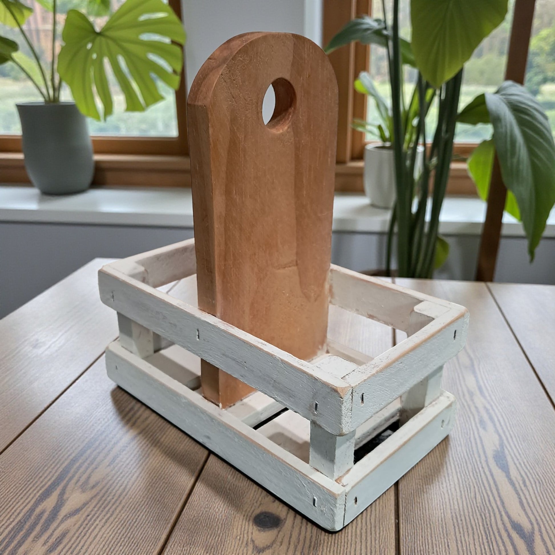 - Wood crate caddy with natural wood handle