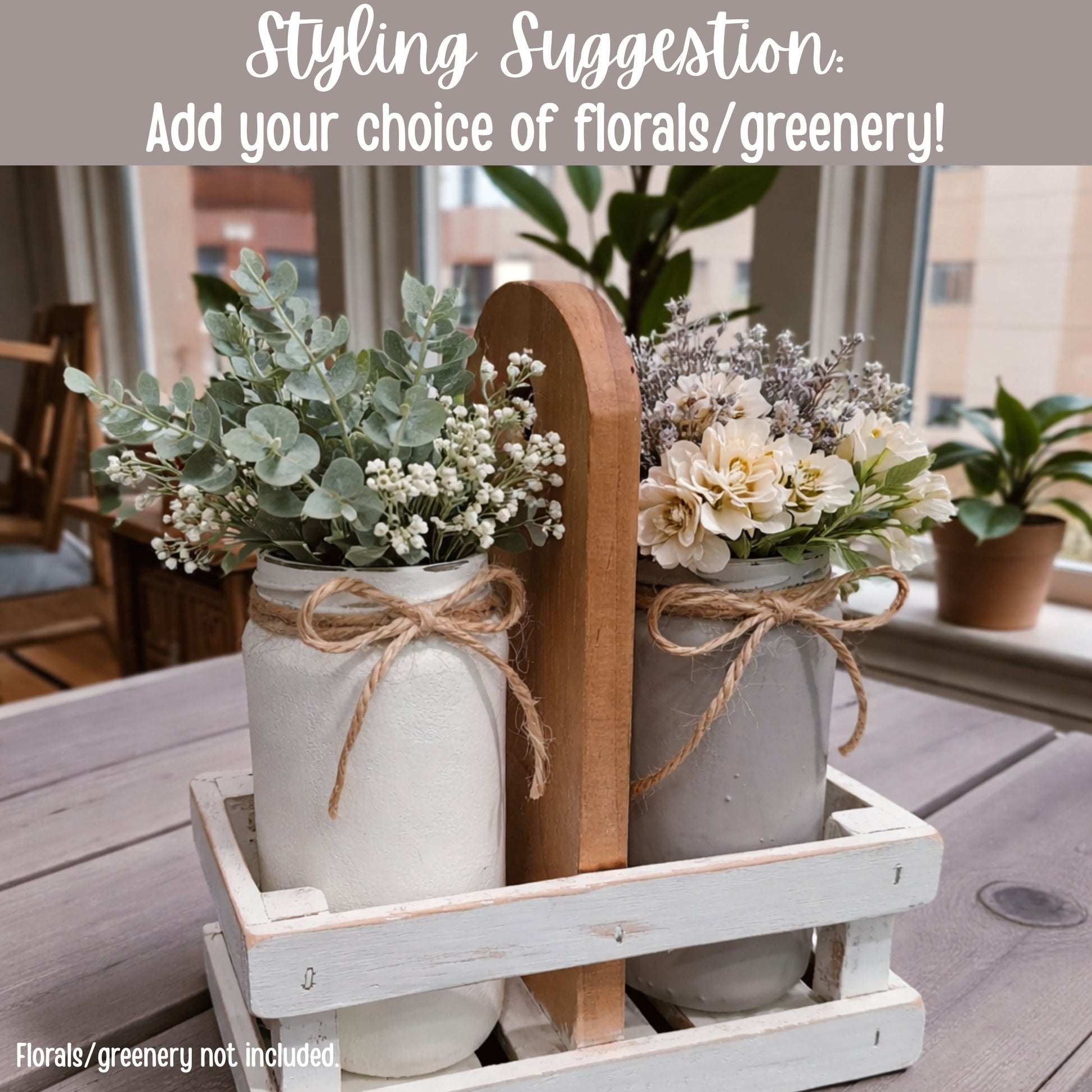The caddy holds two coordinating glass jar vases — one in Plaster white and the other in a soft Mineral tone — both lightly distressed to allow the threaded rim detail to show through. Twine accents add texture and classic farmhouse appeal.